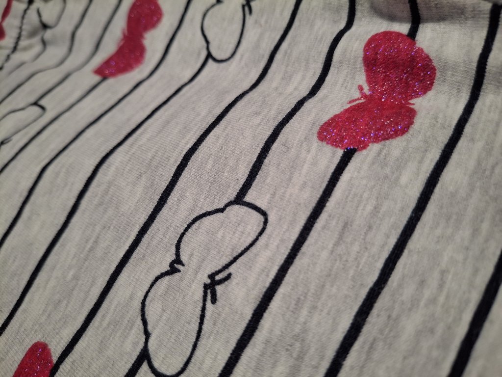 Vzor: Světle šedý podklad zdobí nadčasové černé vodorovné proužky, které doplňují hraví růžoví a bílí motýlci.